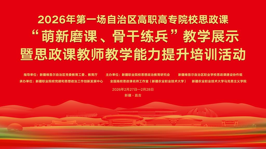 2026年2月27日至28日,自治区高职思政课“萌新磨课、骨干练兵”教学展示暨教师教学能力提升培训活动在新疆农业职业技术大学成功举办。来自全疆27所中高职院校马克思主义学院的负责人、思政课骨干教师和青年教师代表近200人参加活动。本次活动由自治区党委教育工委、自治区教育厅指导,新疆职业院校思想政治教育研究会、自治区职业学校思政课建设协作组联合主办,自治区职业院校党建和思想政治工作创新发展中心、全国高校思政课...