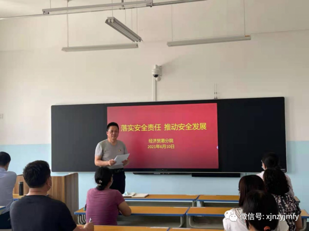 6月10日16:30,分院全体教师在1508教室开展“安全生产月”系列活动。首先,党总支负责人郑建军书记宣读2021年经济贸易分院“安全生产月”宣传活动方案。