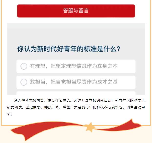 为扎实推进习近平新时代中国特色社会主义思想进学校、进课堂、进头脑,推进“大思政课”建设,丰富教育内容,广泛调动师生参与活动的积极性,引导学生坚定中国特色社会主义道路自信、理论自信、制度自信、文化自信,立志听党话、跟党走,树立正确的世界观、人生观、价值观,经济贸易分院深入开展“悦读伴我成长”职教学生读党报活动。