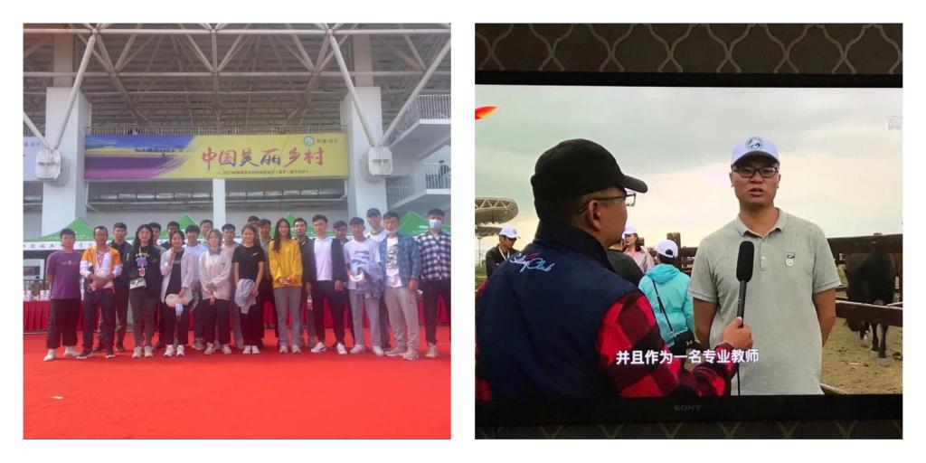 左图为参加天马节学生和天马节赛事主管兽医工作者们的合影。右图为在观看完天马节赛事及表演后,冯凯接受新疆电视台10套品马天马的节目采访,在接受采访的过程中表示,这次带领学生参加天马节,意义非凡,学生都对所学的马产业技术专业都表达了前所未有的兴趣。在整个伊犁的调研活动中,感受到了新疆马产业的蓬勃发展,相信在我校马产业学生毕业后,一定会找到满意适合的本专业的工作。