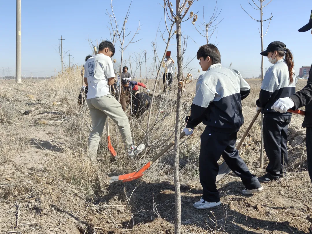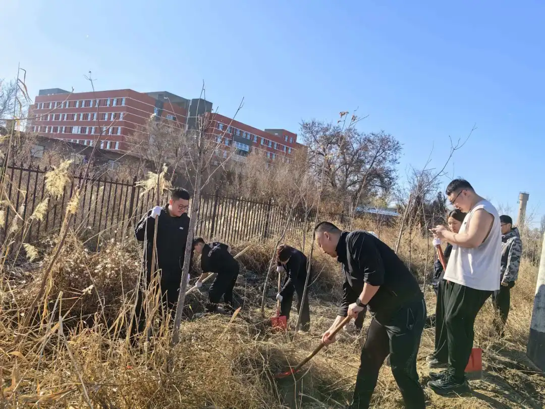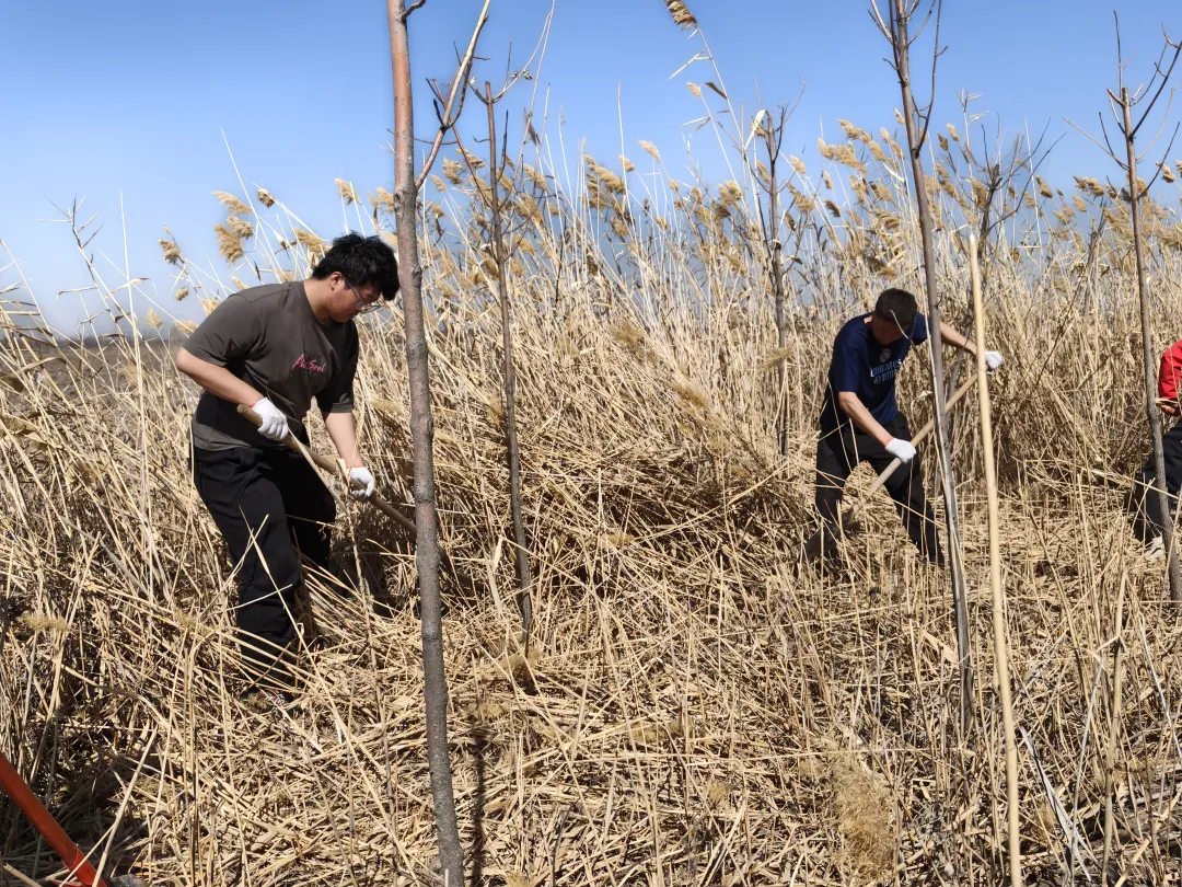 当天上午,耕读实践现场春意盎然、热火朝天。同学们干劲十足,严格遵循分工、默契配合、协同作战,或弯腰俯身拔除杂草,或挥锄清理枯枝落叶,或推车集中清运垃圾。面对林带中根系深、韧性强的顽固杂草,同学们毫不退缩,汗水虽浸湿衣衫,却不减劳动热情。一片片杂草被清理干净,一条条林带焕然一新,学子们用双手为防风林带“美颜”,用实干守护农田生态屏障。