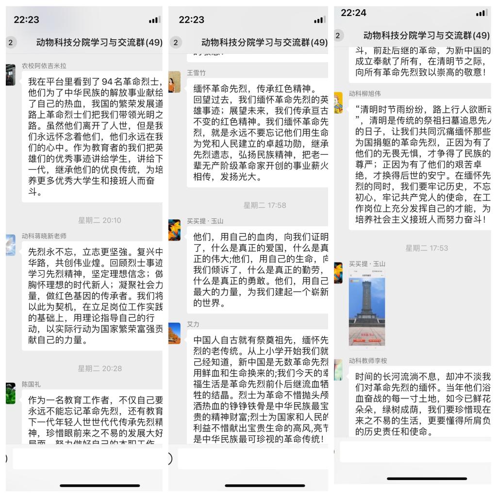 现代畜牧党支部书记蒋晓新:今天是清明节,我在网上祭奠缅怀了革命先烈,向乌鲁木齐烈士陵园陈潭秋烈士敬献了鲜花,以表我的缅怀和崇敬之心意。革命先烈为了国家和民族解放、民族振兴大业抛头颅、河洒热血才有了我们今天幸福安宁的生活。缅怀他们,继承遗志,做为新时代的高职教师,党的高校基层组织干部,我一定为党的教育事业努力工作,积极做出应有的贡献!革命先烈安息,革命精神永存!