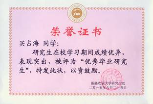 买占海,2011年届畜牧兽医专业毕业生,在校期间学习成绩优秀,通过“专升本”考试进入新疆农业大学本科动物科学专业学习,本科毕业后继续攻读本校研究生,2015年研究生毕业后因学业成绩优秀在新疆农业大学留校任教至今,现讲师职称,2020考入甘肃农业大学博士,攻读博士学位。