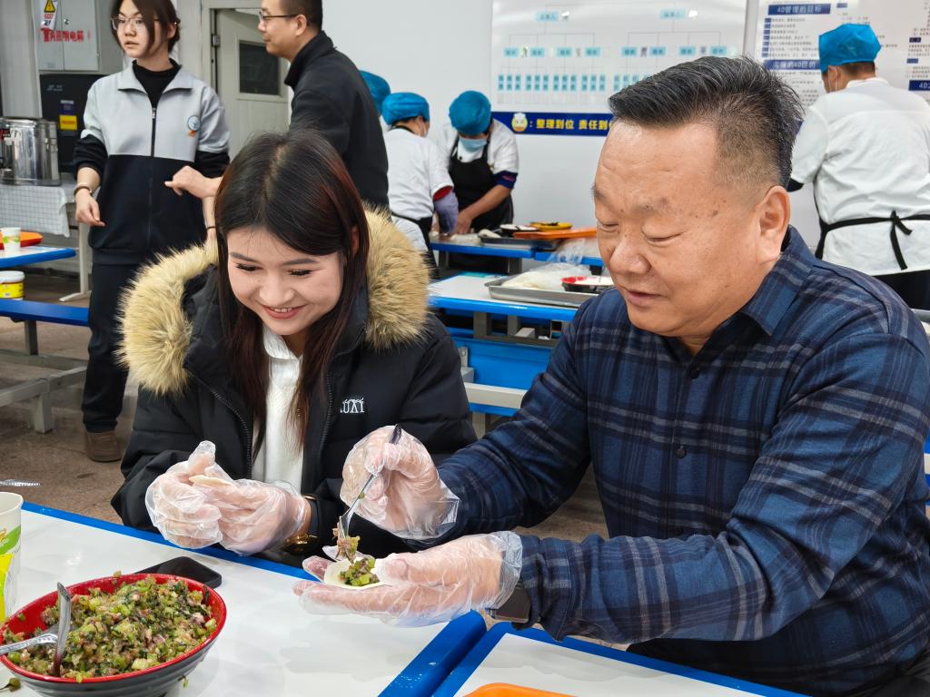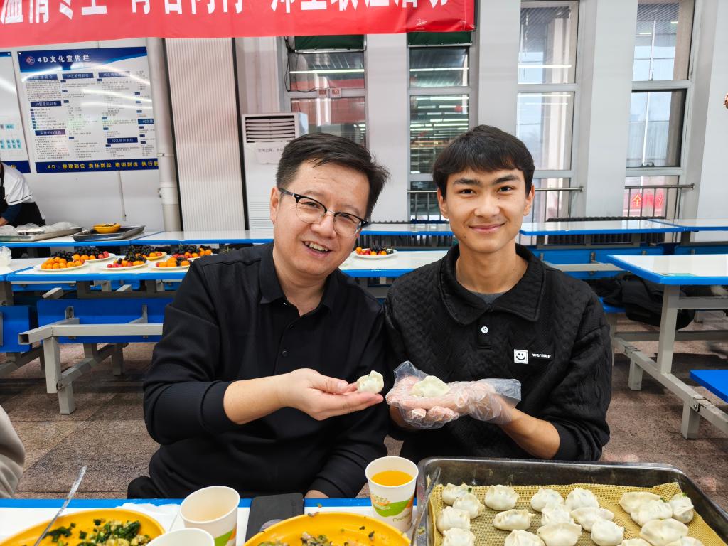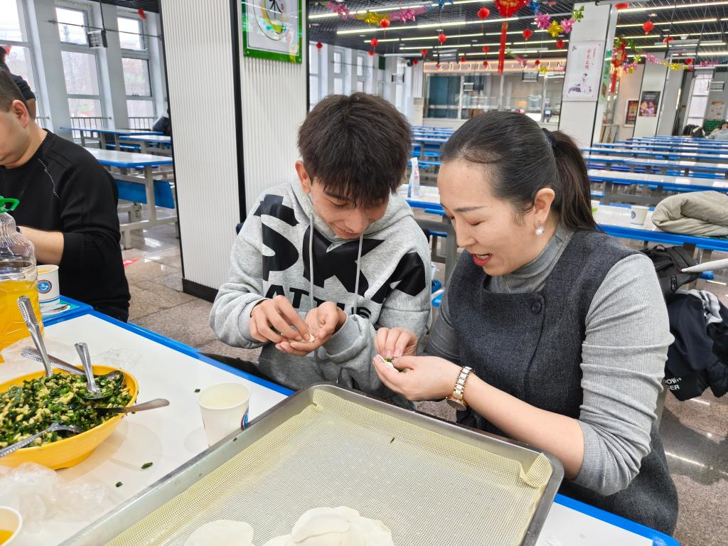 最受期待的师生共同包饺子环节热闹登场!现场早已备好牛肉芹菜、韭菜鸡蛋等多样馅料及齐全工具,师生们围坐一桌,挽起袖子分工协作,擀皮、包馅、捏褶,欢声笑语中,形态各异的饺子逐渐摆满餐盘。