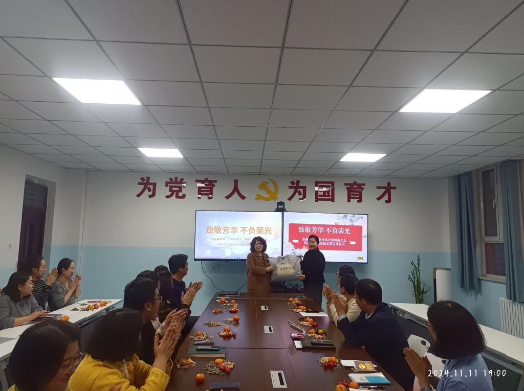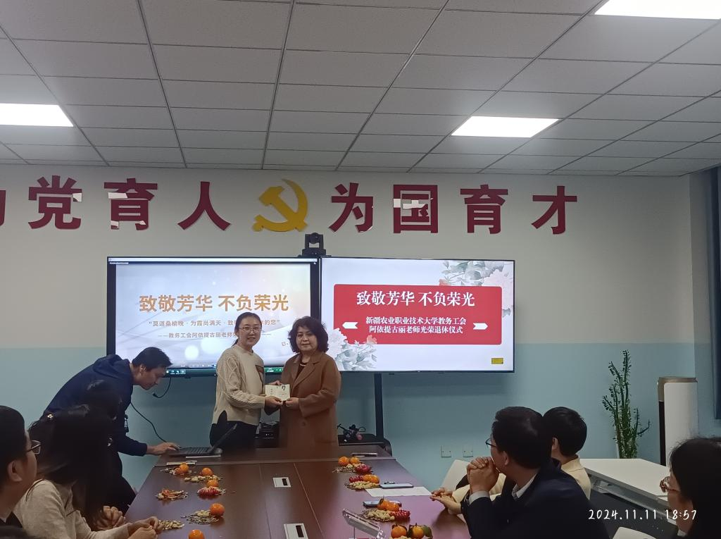 11月11日下午,学校教务直属工会为退休教师阿依提古丽老师举办光荣退休仪式。校党委常委、副校长邓双义出席活动,学校人事处、工会、离退休工作处专程安排人员到会,教务工会全体教职工以及阿依提古丽老师曾经工作过的生物科技分院领导和教师代表共20余人参加活动,职业教育研究中心主任朱晓敏主持活动。