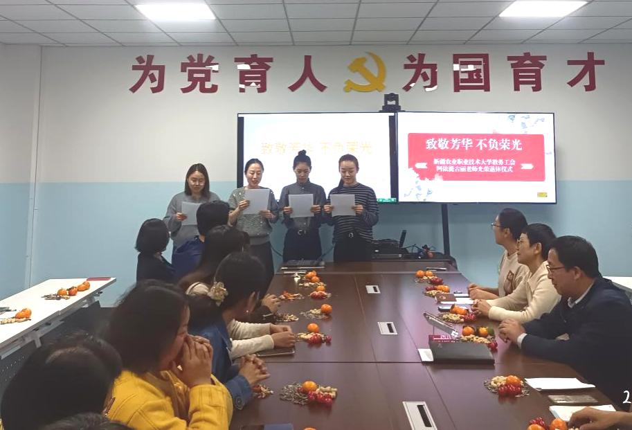 学校党委常委、副校长邓双义表示,阿依提古丽老师见证并参与了学校从昌吉农校、新疆农业职业技术学院到新疆农业职业技术大学的发展历程,感谢她30多年来对学校的无私奉献,希望她退而不休,保持老教师光荣本色,继续一如既往地关心支持学校,同时也祝愿她身体健康、家庭幸福,学校这个温暖的大家庭是她永远坚强的后盾。