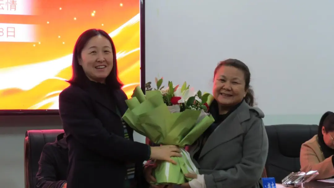 动物科技学院教职工代表王睿老师送上亲切祝福:“您即将告别这熟悉的校园,开启人生新的篇章。我们心中虽有万般不舍,但更多的是对您的深深祝福。愿您的退休生活如诗如画,充满阳光与欢笑,所有的日子都洋溢着幸福的味道。虽然您离开了讲台,但您的教育精神将永远铭刻在我们心中,成为我们不断前行的动力源泉。我们会传承您的敬业与奉献,努力让教育的火焰在校园里燃烧得更加旺盛。”伴随着热烈的掌声和深情的祝福,新疆农业职业技术大学党委常委、副校长田晓霞同志为阿依吉米拉·胡吉老师颁发光荣退休纪念奖章和光荣退休证书;新疆农业职业技术大学工会主席马勇同志为阿依吉米拉·胡吉老师赠送纪念品;动物科技学院副院长季建莉同志向阿依吉米拉·胡吉送上鲜花。这些礼品承载着学校对阿依吉米拉·胡吉老师的深深感激与敬意,也象征着她教育生涯的光辉荣耀。