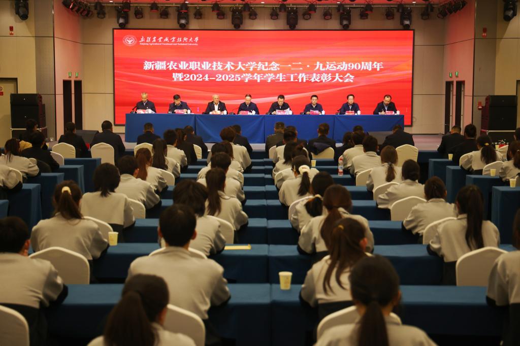 12月9日下午,新疆农业职业技术大学举行纪念一二·九爱国主义运动90周年暨2024-2025学年学生工作表彰大会。学校党委书记徐耀宗,学校党委副书记康华,学校党委常委、副校长吾甫尔・艾买提江,学校党委常委、副校长杨璇,学校党委常委、纪委书记、监察专员(二级高级监察官)彭亮,学校党委常委、副校长邓双义,学校党委常委、统战部部长卢家峰,学校党委常委、组织部部长李皓出席大会。各学院和相关部门主要负责人、教师代表、学...