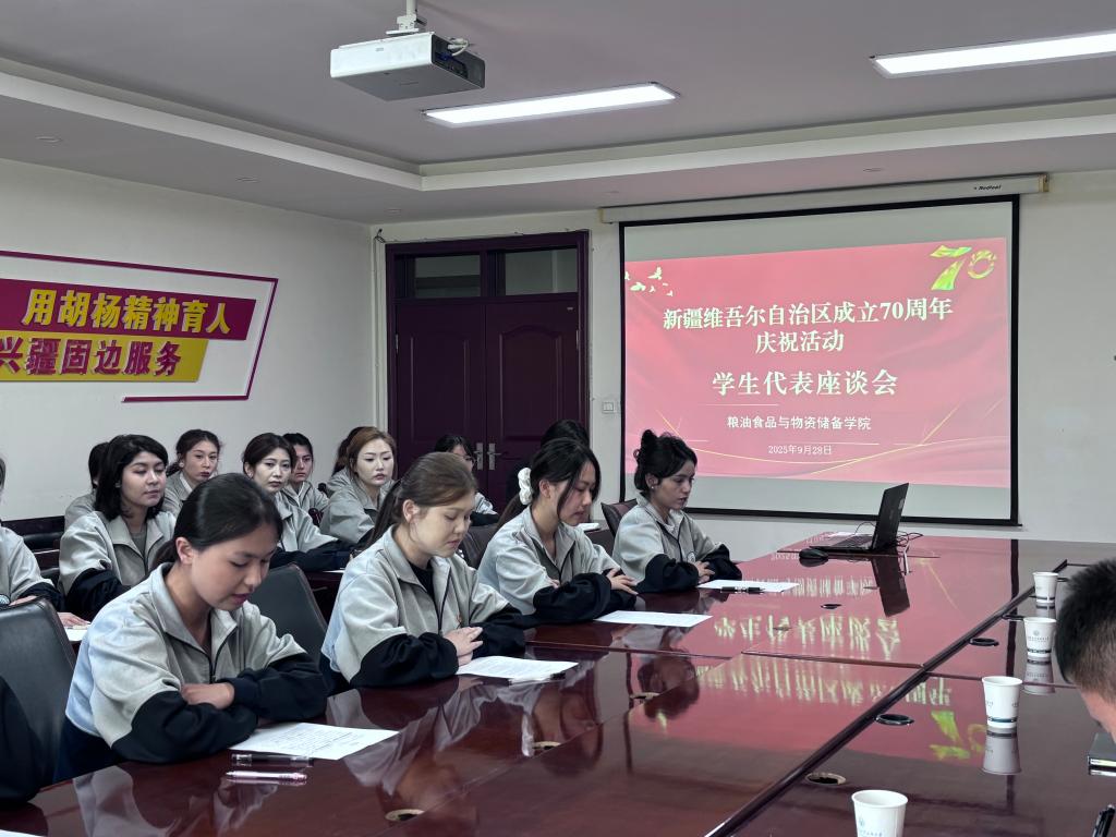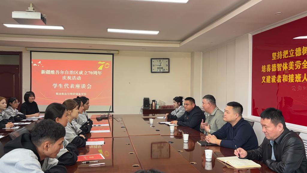 “从排练时的互帮互助,到活动后的持续交流,从迎接中央代表团时的心潮澎湃,到欢送时的依依不舍,我们不仅收获了荣誉,更收获了跨越民族的友谊和对中华民族共同体意识的深刻理解!”9月28日上午,粮油食品与物资储备学院召开新疆维吾尔自治区成立70周年活动参与者专题座谈会。59名亲历迎接、欢送中央代表团的学生代表,20名现场参加文艺晚会的学生代表,与杭州路街道、金谷社区及学院领导围坐一堂,共话活动中的成长与感悟,将这段珍贵经历转化为立德树人的生动教材,为深化学生思想政治教育注入鲜活动能。