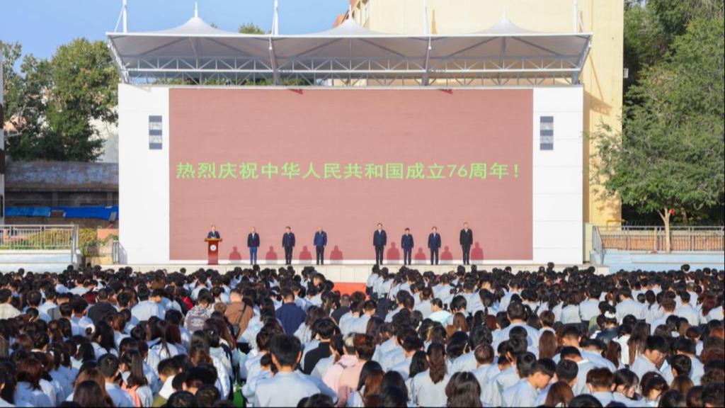 为热烈庆祝中华人民共和国成立76周年,增强广大师生民族自豪感与凝聚力,引导全校师生增强“四个意识”、坚定“四个自信”、拥护“两个确立”、做到“两个维护”,不断增强对伟大祖国、中华民族、中华文化、中国共产党、中国特色社会主义的认同,进一步铸牢中华民族共同体意识。9月30日上午,新疆农业职业技术大学乌昌各校区同步举行“庆祝中华人民共和国成立76周年”主题升国旗仪式。学校党委书记徐耀宗出席并讲授国旗下的思政课,学校在家党委班子成员、各部门主要负责同志、各学院党政主要负责同志,全体教职工及学生代表近21000余人参加升国旗仪式。本次活动由校党委常委、副校长吾甫尔·艾买提江主持仪式。