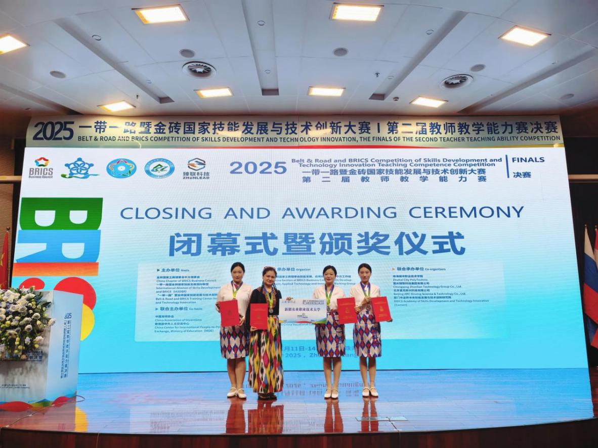 在刚刚落幕的2025一带一路暨金砖国家技能发展与技术创新大赛第二届教师教学能力大赛全国决赛中,由我校张园、黄晶晶、麦尔斯耶·艾赛提、朱营莉四位老师组成的教学团队,凭借其精心打造的 “送给学生的三把金钥匙-非遗药茶融合” 教学作品,从全国众多优秀队伍中脱颖而出,最终以优异的表现,荣获全国二等奖(银牌),并在二等奖获奖团队中排名第一!该团队是我校在本届大赛中唯一荣获二等奖的队伍,其比赛精彩片段更在闭幕式上作为优秀案例进行了展播,赢得广泛赞誉。