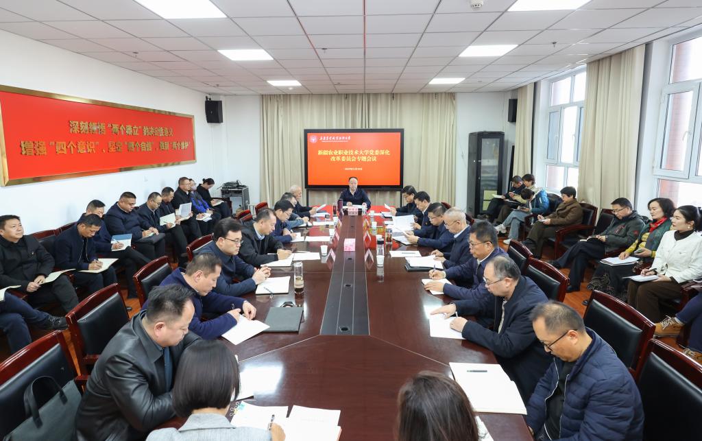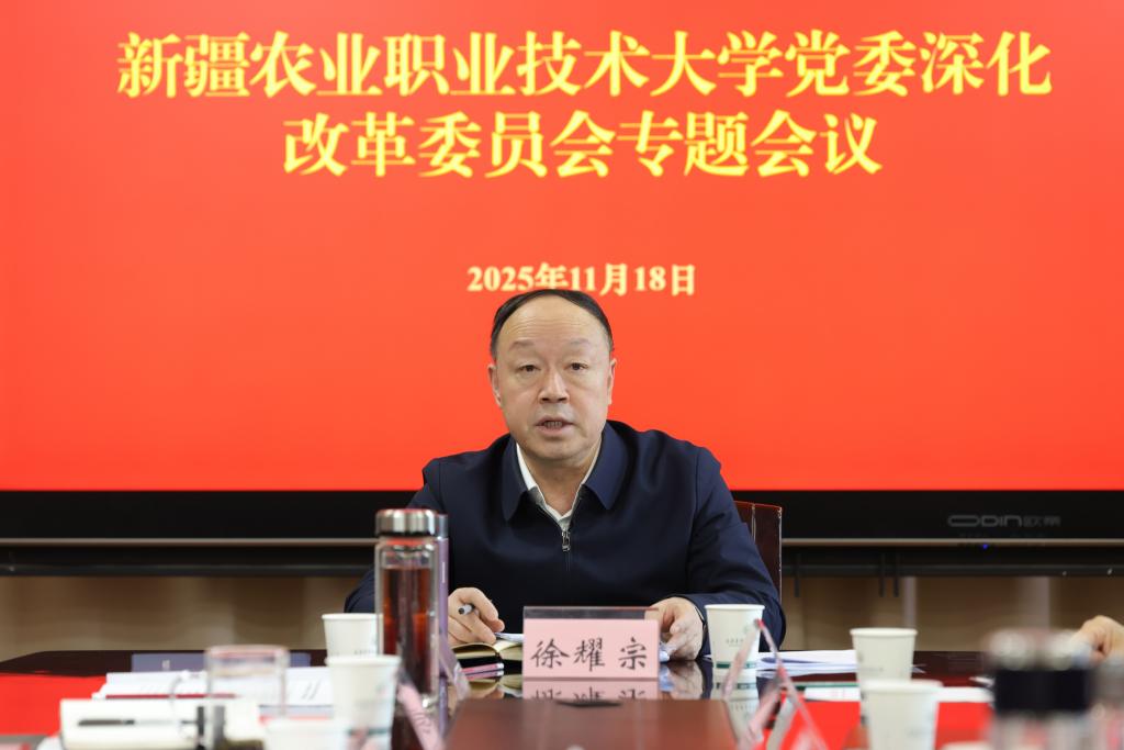 11月18日,新疆农业职业技术大学召开党委深化改革委员会专题会议,深入学习贯彻党的二十届三中、四中全会精神以及习近平总书记论全面深化改革重要讲话精神,贯彻落实自治区党委十届十五次全会精神,聚焦学校深化校院两级管理体制机制改革,推动学校“十五五”规划编制工作。学校党委书记徐耀宗出席会议并讲话,党委副书记、副校长(主持行政工作)杨贵泉主持会议。党委副书记、副校长(主持行政工作)杨贵泉同志领学习近平总书记论全面深化改革。会议听取学校党委常委、副校长杨璇同志介绍2025年学校深化改革工作要点、校院两级管理体制机制改革落实情况以及“十五五”规划编制工作进展情况,围绕存在的问题和困难提出工作建议。