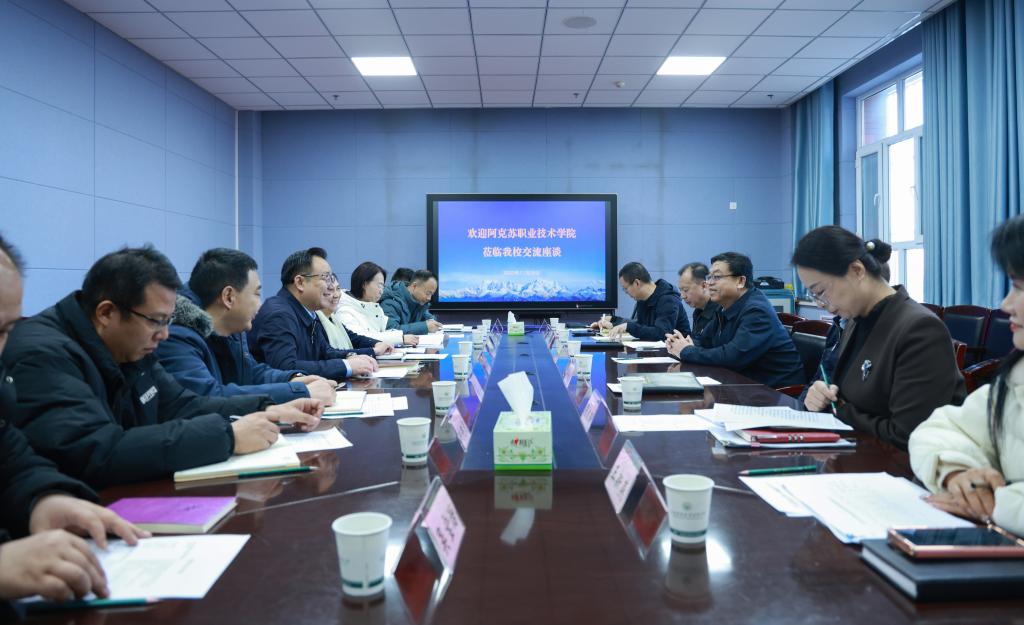 11月26日,阿克苏地委教育工委常务副书记、阿克苏地区教育局党组书记、阿克苏职业技术学院党委书记赵鹤征一行莅临学校调研。双方在图书馆二楼会议室围绕办学定位、人才培养、产教融合等方面深入交流。校党委副书记、副校长(主持行政工作)杨贵泉出席座谈会,校党委常委、副校长邓双义主持座谈会。