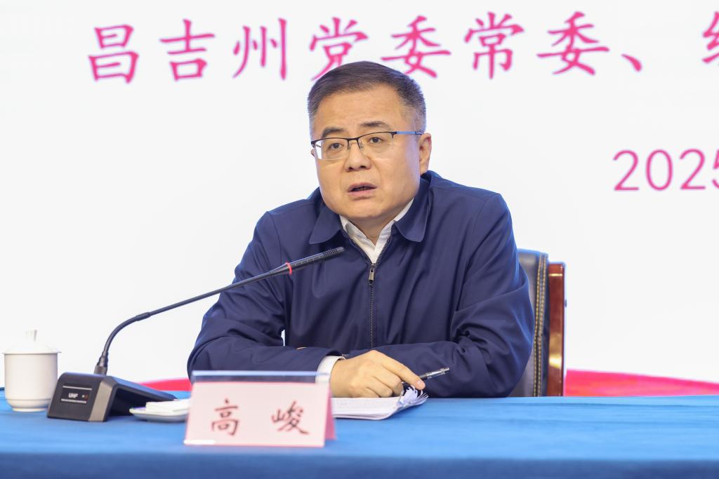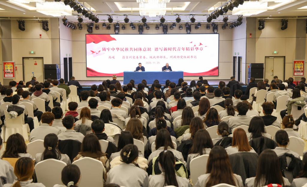 高峻常委从四个方面开展授课:一是铸牢中华民族共同体意识的提出和发展;二是铸牢中华民族共同体意识的重大意义;三是准确把握铸牢中华民族共同体意识的核心要义;四是铸牢中华民族共同体意识的实践路径以及在昌吉的生动实践。高峻常委引用新疆阿勒泰“00后”迪尼格尔·衣拉木江与来自山西的运动员赵嘉文,共同将火炬嵌入主火炬台“大雪花”的故事为切入点,带领我们系统回顾了铸牢中华民族共同体意识这一重要理念的提出与深化过程,让我们清晰地看到了其发展的思想脉络和时代背景。从“十二个必须”和四个“必然要求”的理论高度和实践维度,深刻阐释了铸牢中华民族共同体意识的重大战略意义。他勉励当代大学生,梦想只有在民族复兴的洪流中才能奔涌向前,青春的力量,唯有在时代伟业的答卷上才能写下辉煌。