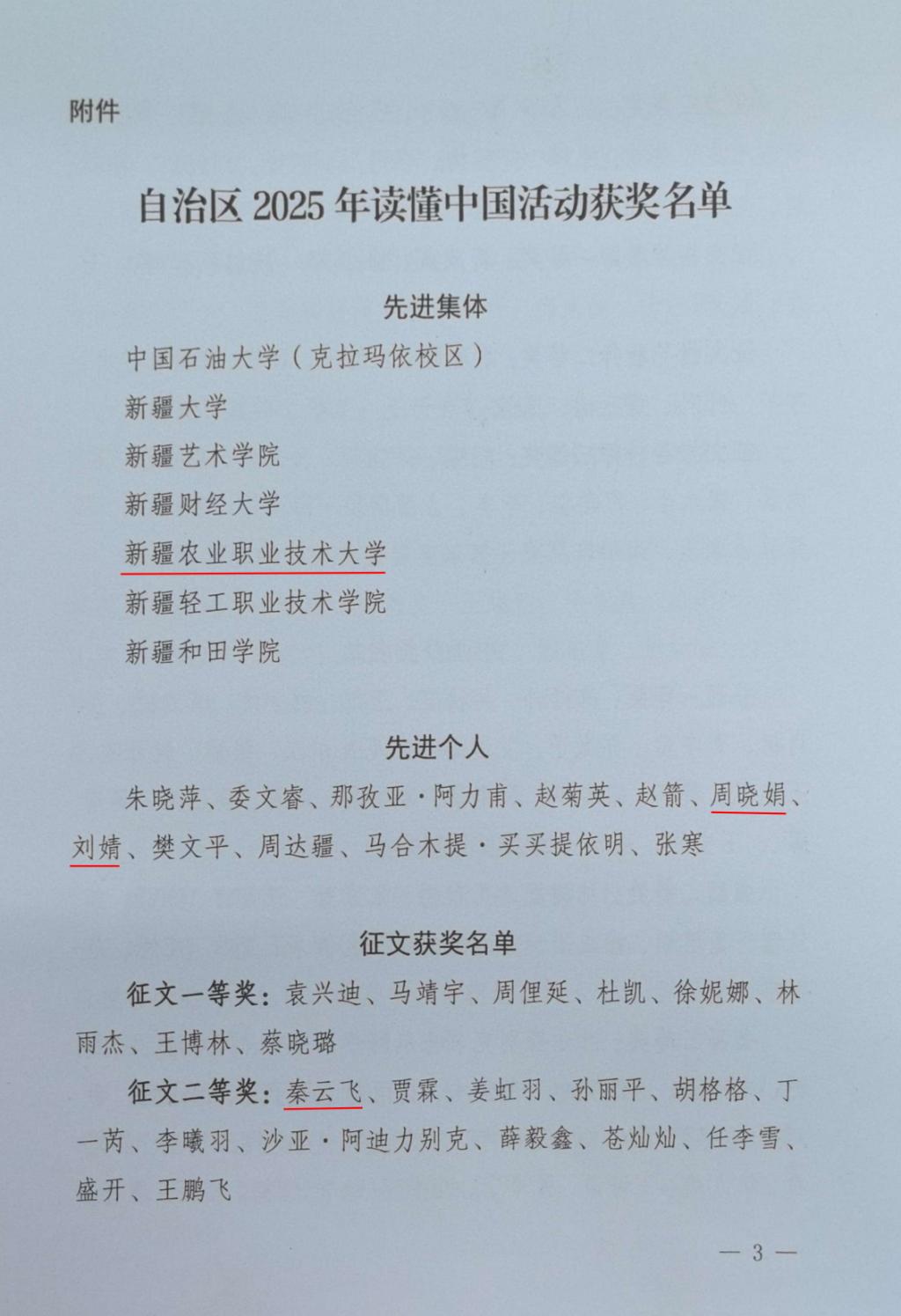 为充分发挥“五老”亲历者、见证者、实践者的优势,向广大青年学生讲好新时代以中国式现代化全面推进强国建设、民族复兴伟业的故事,引导青年学生赓续党的红色血脉、弘扬党的优良传统。根据教育部关工委《关于开展 2025 年“读懂中国”活动的通知》(教关委函〔2025〕5号)要求,自治区组织各高等院校和职业院校开展了 2025 年“读懂中国”活动。此次活动历时6个月,通过层层选拔推荐,经自治区教育厅关工委组织专家评审,我校多部作品在活动中获奖,学校获得先进集体称号。