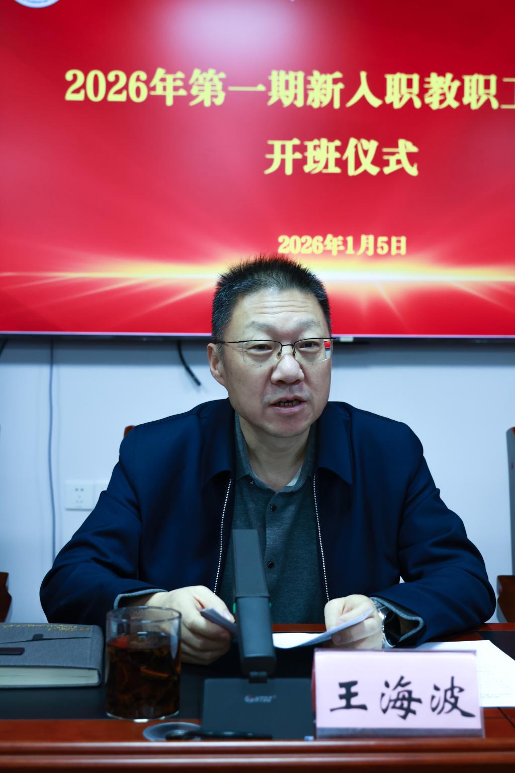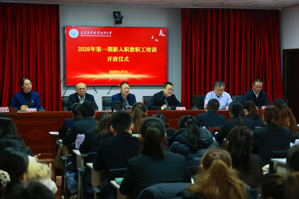 2026年1月5日上午,新疆农业职业技术大学举行2026年第一期新入职教职工培训开班仪式。学校党委副书记、副校长(主持行政工作)王海波,学校党委副书记康华,学校党委常委、副校长吾甫尔·艾买提江出席。学校党委教师工作部、教务处负责人以及全体新教师和教职工代表参加开班仪式。开班仪式由康华主持。