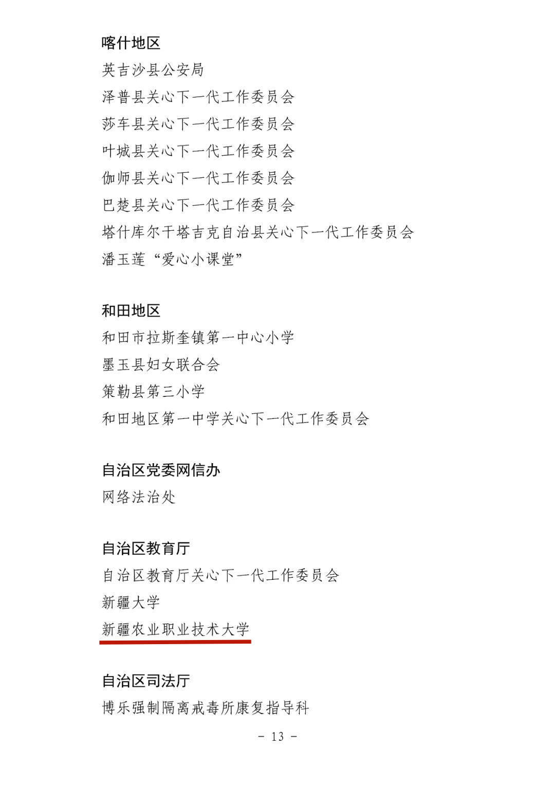 今年是自治区成立70周年、关心下一代工作委员会成立35 周年。经自治区党委批准,自治区党委老干部局、自治区关心下一代工作委员会开展了自治区尊老爱幼先进表彰评选工作。经评选,学校获自治区关心下一代工作先进集体称号,周晓娟同志获自治区关心下一代工作先进个人。