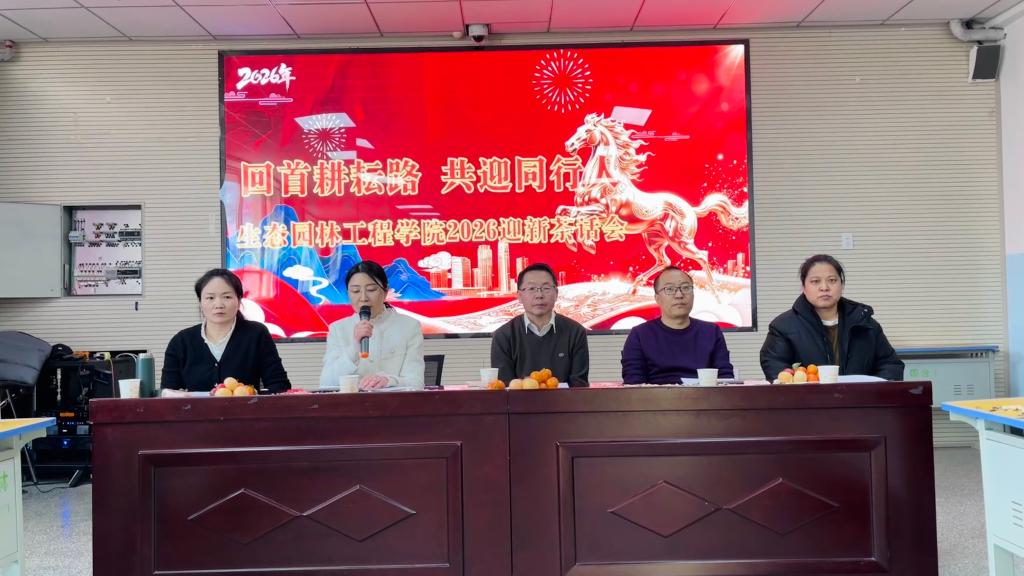 2026年1月20日下午,生态园林工程学院在1112教室,举行“回首耕耘路,共迎同行人”迎新茶话会。学院党政班子与全体教师齐聚一堂,同忆奋斗岁月,共绘发展蓝图。活动由学院党委副书记李春燕主持。吴克煜回顾了2025年学院在教育教学、学生教育管理、科研与社会服务、“双高”建设工作中取得的成绩,并向辛勤耕耘的全体教师致以崇高敬意。