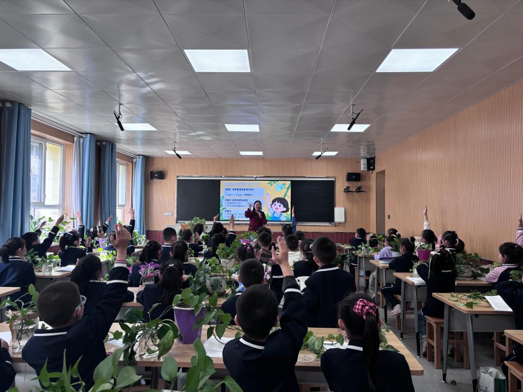 针对小学生的认知特点,李倩老师通过精美的图片、生动的视频和趣味横生的比喻,带领孩子们走进了神奇的植物世界 。从有性繁殖、无性繁殖到孢子繁殖,从绿萝茎上的气生根到绿萝水培的技巧,抽象的植物学知识变得直观可感。孩子们踊跃举手发言,现场气氛热烈。