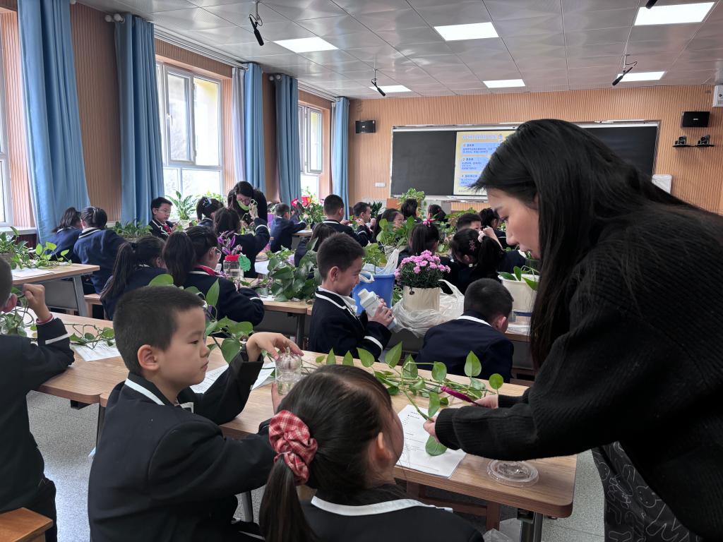 理论知识讲解后,孩子们化身为“小小园艺师”,亲手体验种植的乐趣。他们小心翼翼地将将带有气生根的绿萝剪下。一位小学生捧着自己插好的绿萝兴奋地说:“原来这样就可以让一盆绿萝变成很多盆呢!我要好好照顾它,看着它生根长大!”。