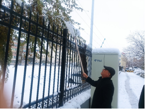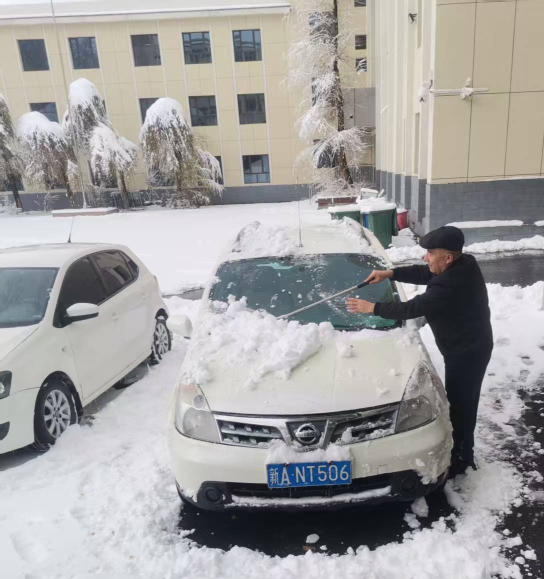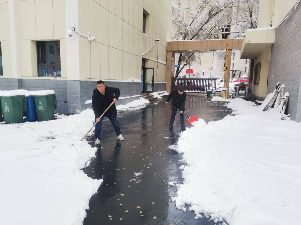 2025年11月6日,许多师生的朋友圈被乌鲁木齐强降雪刷屏。白茫茫的景象背后,讲述着这场天气的极端与复杂。我校乌鲁木齐校区银装素裹景色很美,但积雪为人员和车辆出行带来诸多不便与安全隐患。为确保校园道路畅通与人员安全,校区基地安保科雪停即响应,组织干部职工及保安人员对校区主干道、楼梯口、出入口等重点区域清扫积雪和坚冰,积极做好防滑工作。