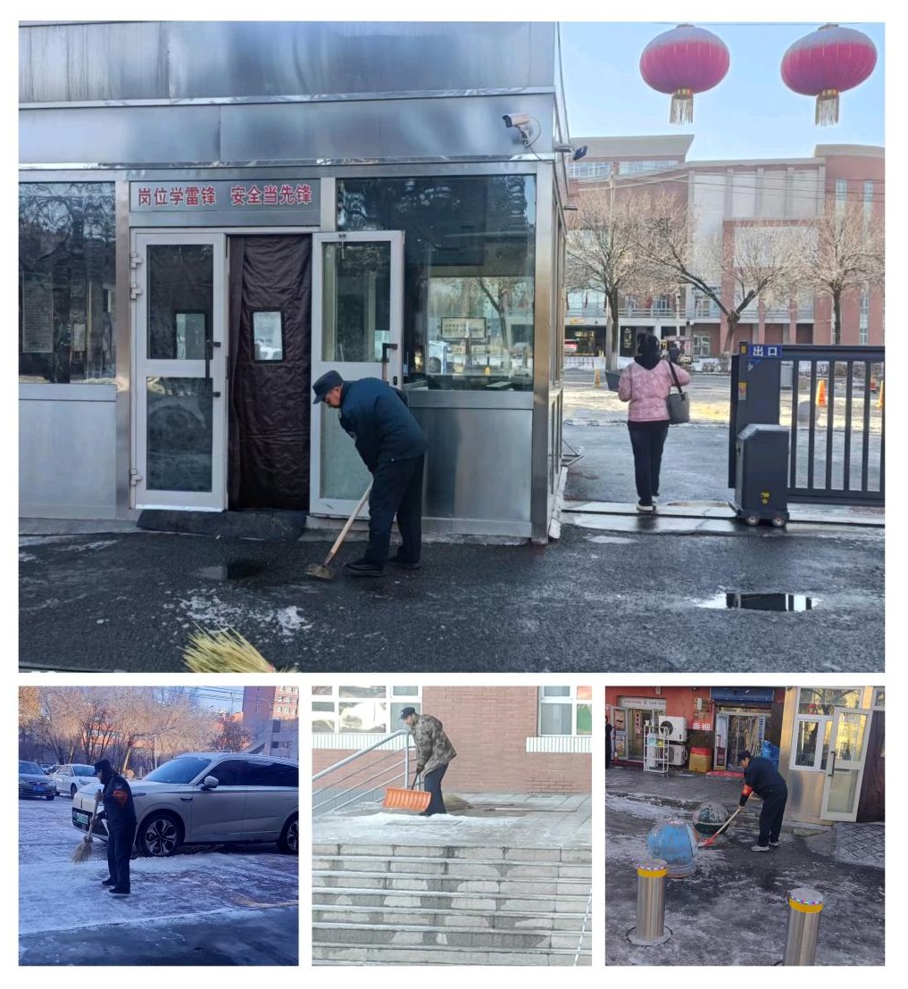 受夜间雨雪影响,11月23日校园路面积雪结冰,给师生出行带来安全隐患。我校安保值班人员以雪为令、闻雪而动,立足岗位践行雷锋精神,自发扛起铁锹和推雪铲、拿起扫帚对校门、楼宇出入口及停车场等重点区域,开展积雪清扫与除冰作业。各值班岗位值班人员分工协作、干劲十足,手冻通红仍坚守一线,高效清理路面和台阶上的冰雪,为师生开辟出安全通畅的出行通道。此次自发清雪除冰行动,彰显了安保队伍的责任担当与服务初心,以实干之举筑牢校园安全防线,用暖心守护传递冬日温情,赢得师生广泛点赞。