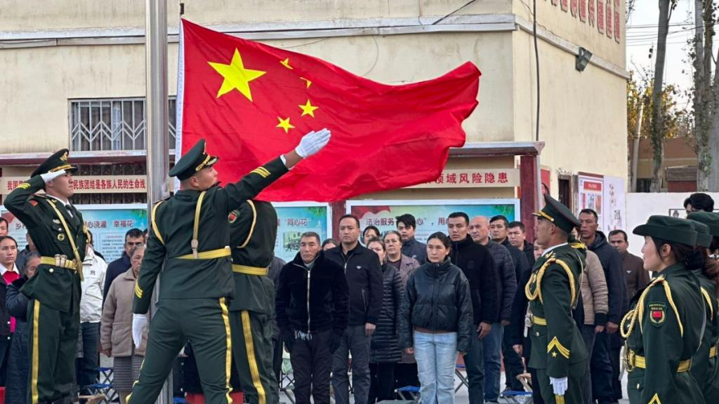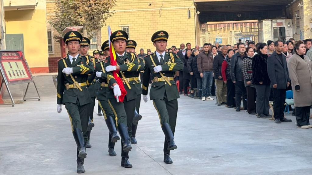 离开问勇广场,国旗护卫队一行来到和田洛浦县阔尕其艾日克村。村落广场上,村民们早早等候:有的搀扶着家中老人,有的牵着孩子的手,眼神里满是对升旗仪式的期待。