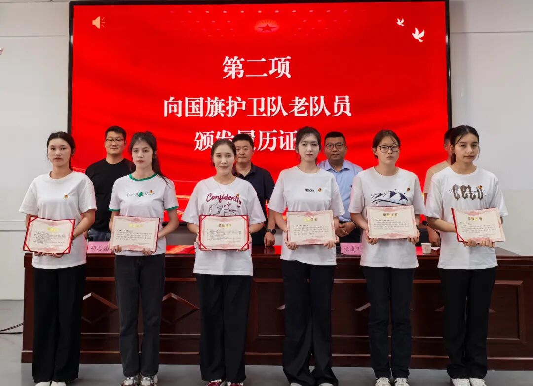 座谈会上,校团委书记于明明以及校团委全体教师分别向校国旗护卫队老队员颁发履历证书,向优秀队员颁发荣誉证书。履历证书记录着老队员们在队期间的付出与成长,荣誉证书则是对优秀队员突出表现的认可,这些证书不仅是一份荣誉,更是一份沉甸甸的责任传承。
