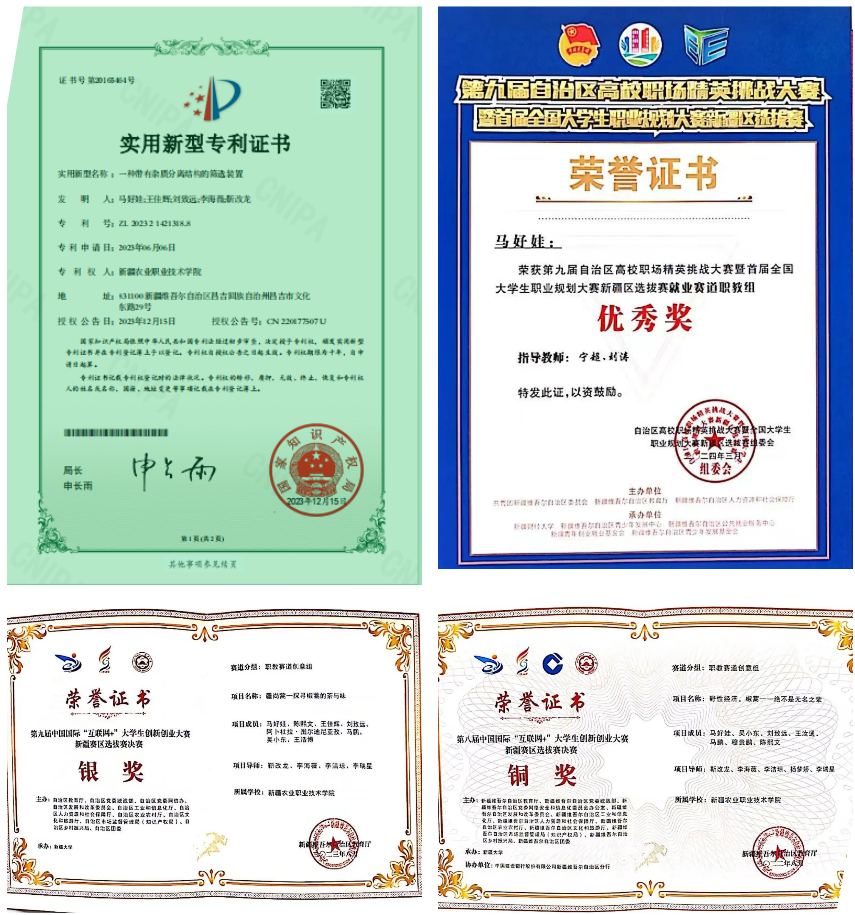 她利用课余时间积极参与各类课外学术科创竞赛与创新研究,先后荣获第二届新疆维吾尔自治区大学生乡村振兴创意大赛省级铜奖两项,第九届“中国国际互联网+”大学生创新创业自治区银奖,荣获第八届“中国国际互联网+”大学生创新创业自治区铜奖,第九届“中国国际互联网+”大学生创新创业自治区铜奖四项,首届全国大学生职业规划大赛新疆区选拔赛决赛优秀奖,以第一发明人身份成功申报实用型专利一项。