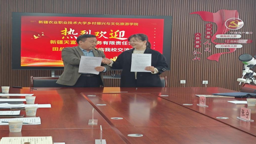 3月9日上午,新疆天富养老服务有限责任公司党支部书记、总经理田心与新疆农业职业技术大学乡村振兴与文化旅游学院院长米吉提·卡的尔签署校企全面合作协议。