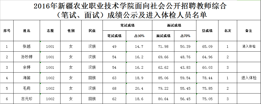 2016年新疆农业职业技术学院面向社会公开招聘教师综合(笔试、面试)成绩公示及进入体检人员名单