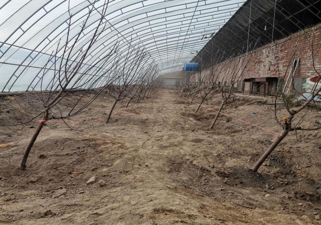 设施果树栽培通常采取向北倾斜60°的方法,首先这样可以有效利用设施空间,避免棚高过低限制树形;其次这样可以增强光合作用,从而增加有机物积累量,提高果实商品价值;最后这样可以方便水肥管理、套袋、采收等管理工作。