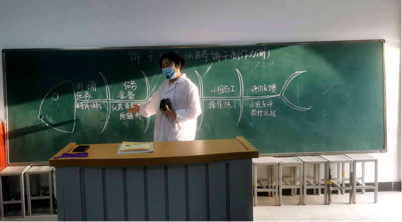 孙睿老师通过鱼骨图对本次实训课程进行分解,首先明确了本次课堂任务——制作曲奇饼干,同学们也提前对课程内容进行预习,掌握了曲奇的配比,老师对操作仪器进行介绍后进行了小组分工。同学们有序准备材料,开始制作曲奇,在过程中听评老师一同与学生参与制作,活跃教学氛围,自主、快乐的课堂真正体现了“教中做、做中教,做中学、学中做”的人才培养模式,孙睿老师展示了自己独特的教学方法和教学特色,让每一位老师受益匪浅。