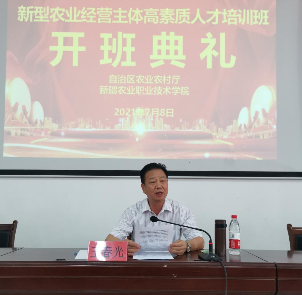 王春光同志代表自治区农业农村厅出席开班典礼,并在开班典礼上对培训班学员提出三点要求:一是要充分认识新型农业经营主体的地位和作用,二是要准确把握新型农业经营主体面临的重要发展机遇,三是要履行好新型农业经营主体担负的职责和使命。