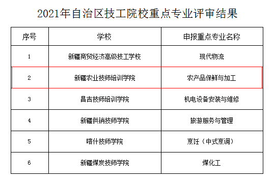 技工教育是国民教育体系和人力资源开发的重要组成部分,承担着为经济社会发展培养高素质技能人才的重要任务,经过多年的专业建设、课程改革、师资培养、质量评价、内部管理等内涵建设,新疆农业技师培训学院实现了技工教育规模和质量的同步发展。2021年10月,“农产品保鲜与加工”专业荣获2021年自治区技工院校重点专业。