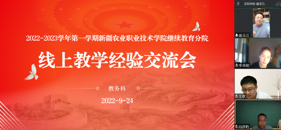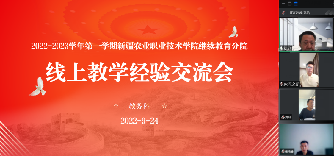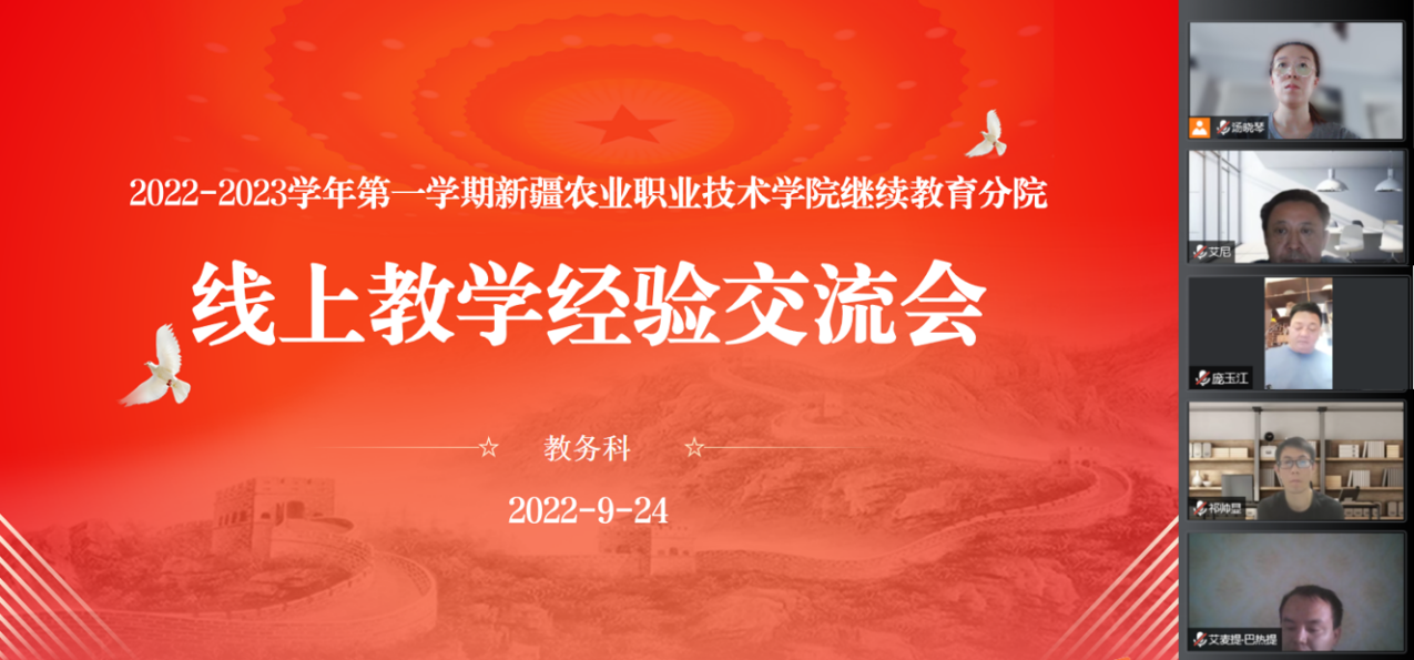 根据新疆农业职业技术学院2022—2023学年秋季学期开学工作相关要求,9月5日起,继续教育分院按照学院教务处统筹部署,全面开展线上教学,实现“学校不停课、教师不停教、学生不停学”。为及时总结线上教学得失、扬长避短,提升教学质量,9月24日分院教务科组织召开了“线上教学经验交流会”,分院院长阿不都艾尼、分院教学副院长庞玉江以及全体教师参加了此次会议。