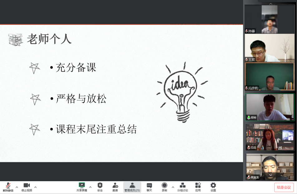 郑帅老师从学生的课堂管理、课程的教学质量、老师的授课方式三个方面进行了分享,线上教学通过难易问题的结合,保证课堂的活跃度,鼓励学生的发言,激发学生课堂的参与度,关注不常发言的学生,给足思考问题的时间;课程要难易结合,储备课程相关的课外的知识,丰富课堂内容,积极了解新事物,和学生产生共鸣。老师个人要充分备课,采用严格与放松的课堂管理,课程末尾注重总结。