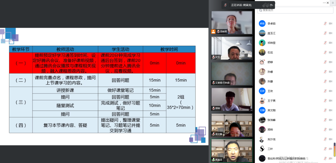 姚富龙老师从课前、课中、课后三个方面分享了自己的经验,课前充分备课、准备丰富的教学资料、提前20分钟在腾讯会议共享课堂要求、多种方式掌握学生考勤,熟练掌握超星、腾讯会议互动活动;课中:严控教学环节,保证学生在课堂听课、做笔记、作业、少量多次互动的合理安排,充分利用上课时间。