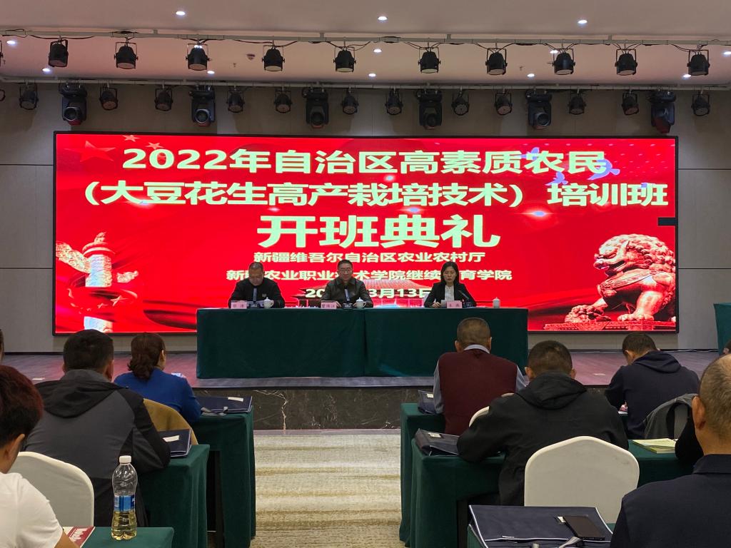 新疆农业职业技术学院紧紧围绕中央一号文件、自治区农业农村厅《关于印发2022年国家现代化农业产业园等13个项目实施方案》的通知(新农计函[2022]954号)精神,于2023年3月11日至22日在昌吉市农民大厦举办2022年高素质农民(大豆、花生高产栽培技术)培训班,来自全疆26个县市的53名学员参加了此次培训。
