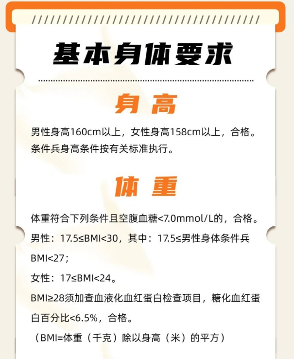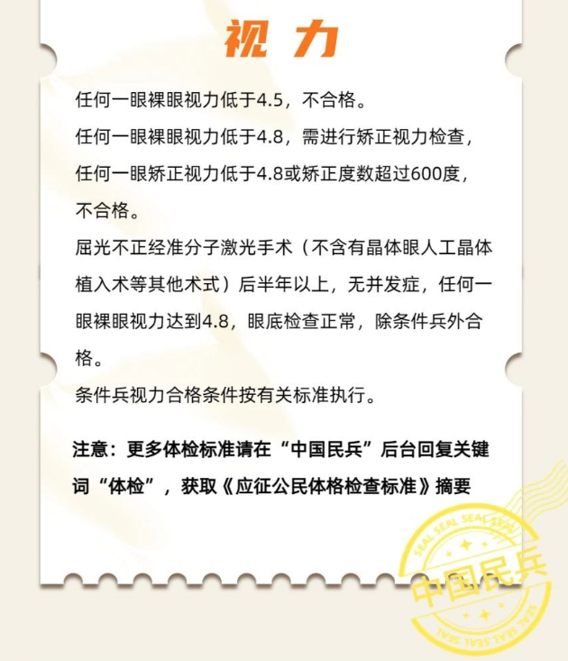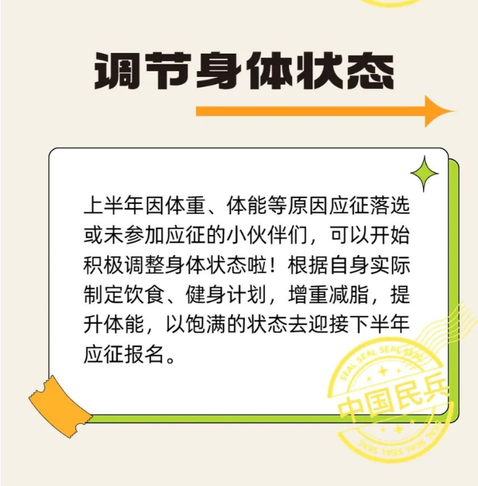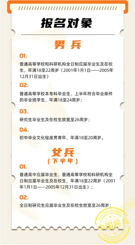 据悉,当前阶段应征报名对象为男青年,条件为:高中(含中专、职高、技校)毕业生及以上文化程度的青年(含高校在校生),年满18至22周岁(2001年1月1日——2005年12月31日出生);普通高等学校本专科毕业生,年满18至24周岁;研究生毕业生及在校生放宽至26周岁;初中毕业文化程度男青年,年满18至20周岁。