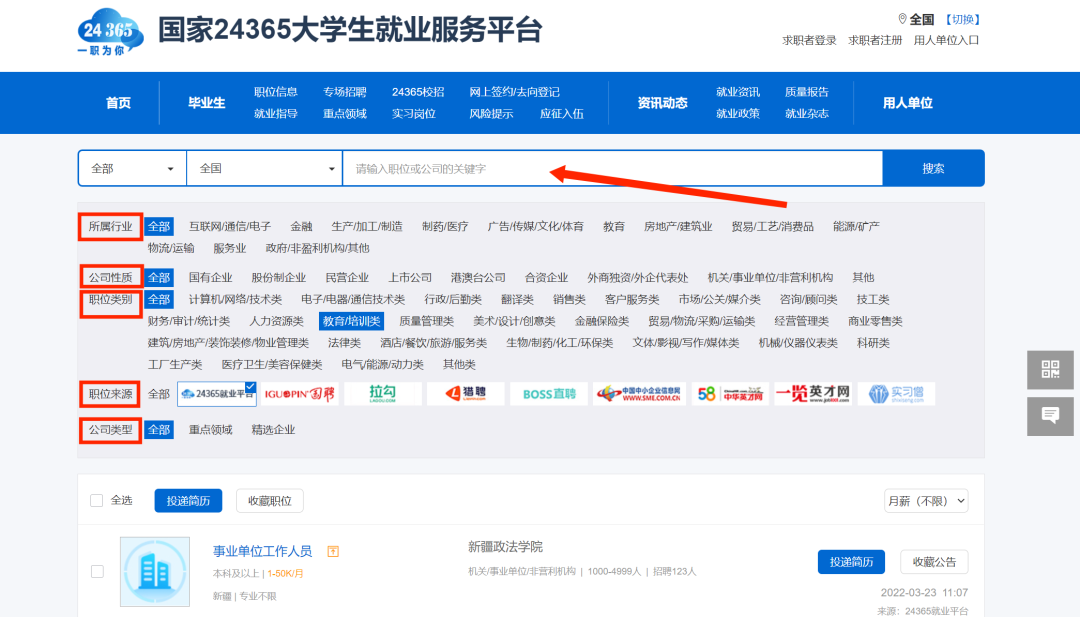 2.进入“就业信息”板块,选择搜索你寻找的职位或是公司的关键字,也可以通过分类筛选,如:所属行业、公司性质、职位类别、职位来源、公司类型进行筛选来找到自己心意的职位或公司。