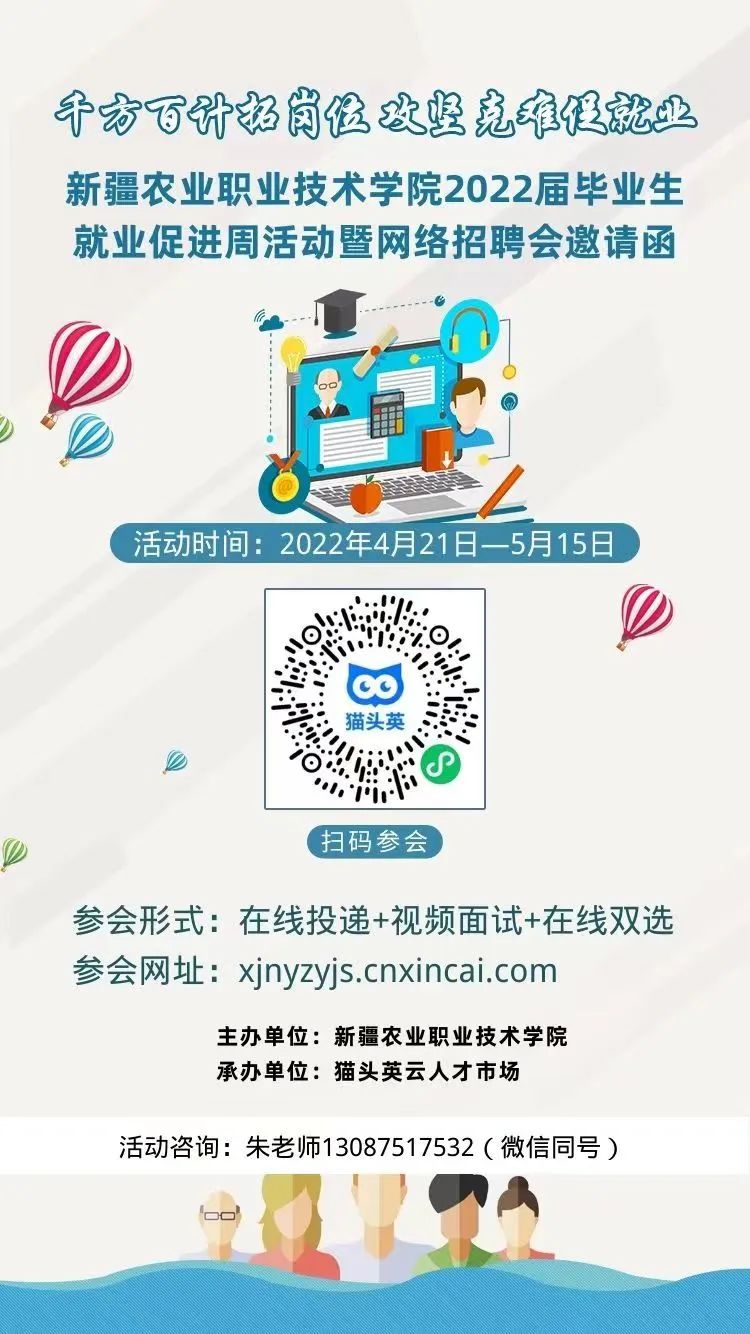 为进一步畅通毕业生就业渠道,抢抓毕业生离校前的求职关键期,全力促进学校2022届毕业生顺利就业。结合“宏志助航计划”及教育部关于开展2022届高校毕业生就业促进周系列活动的通知,由新疆农业职业技术学院招生就业办公室主办,猫头英云人才市场承办的新疆农业职业技术学院2022届毕业生系列招聘活动已开启,现诚挚邀请新疆农业职业技术学院的2022届毕业生参加!