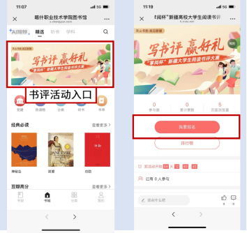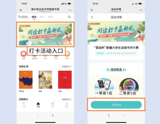 点击顶部活动图—【报名】—【选书】,阅读满15分钟后再次点击图片进入后可打卡。