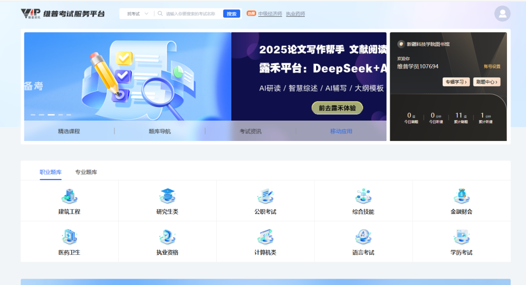 12 个热门专辑 + 双题库(45 万 + 卷 / 2500 万 + 题 + 200 万 + 专业题),5.3 万 + 视频 / 5.5 万 + 真题,适配考证与专业课。