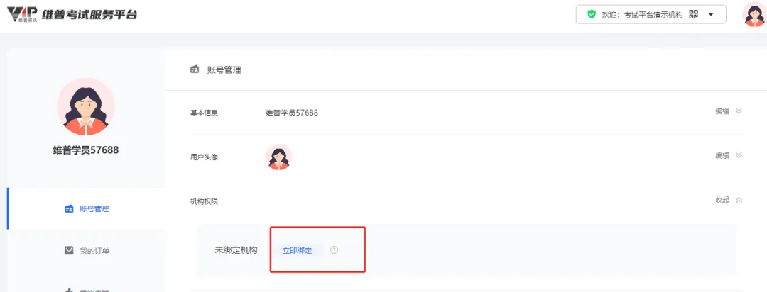 学校IP范围内注册登录个人账号,平台将自动识别IP,可按提示绑定机构权限,或在个人中心内进行手动绑定,绑定后可获得180天机构有效权限。
