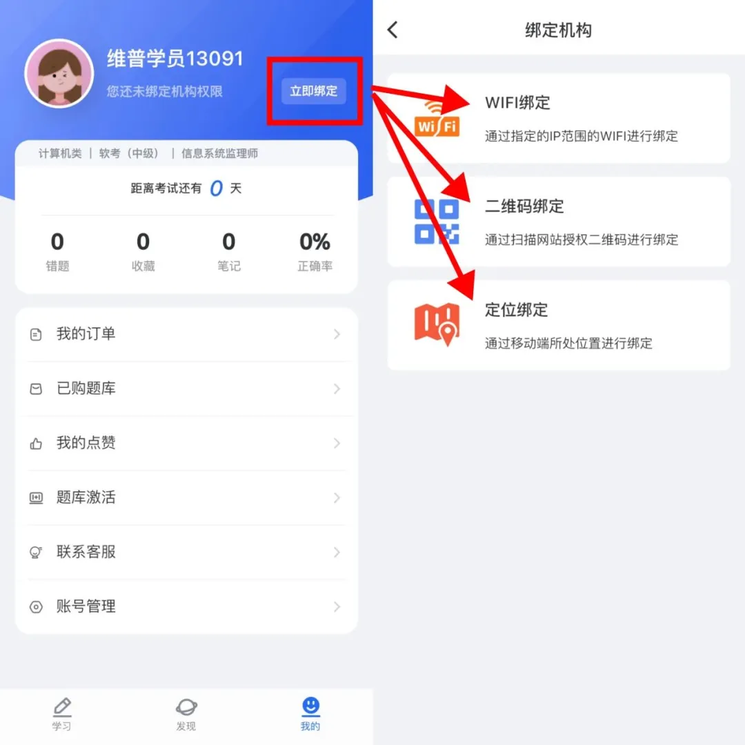 ③若机构添加了经纬度位置定位,机构用户在机构所在地理位置范围内,可以通过“维普考试”App绑定页面的“定位绑定”功能实现机构绑定。