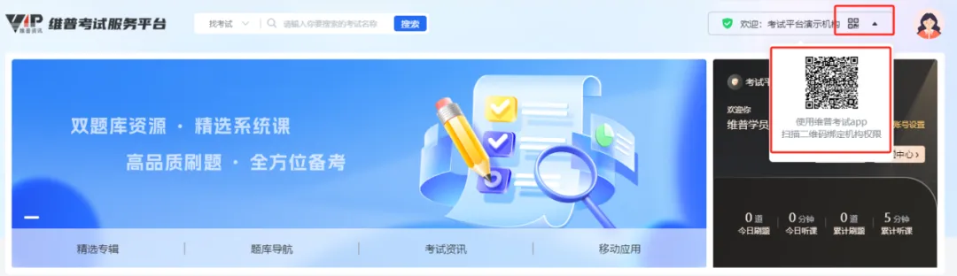 ②通过App扫描PC端机构授权二维码:用户在机构IP范围内打开维普考试服务平台官网,机构授权二维码会显示在首页右上角的机构名称下;(动态二维码仅30秒有效期,扫描时若显示已过期,请刷新页面重新扫描)
