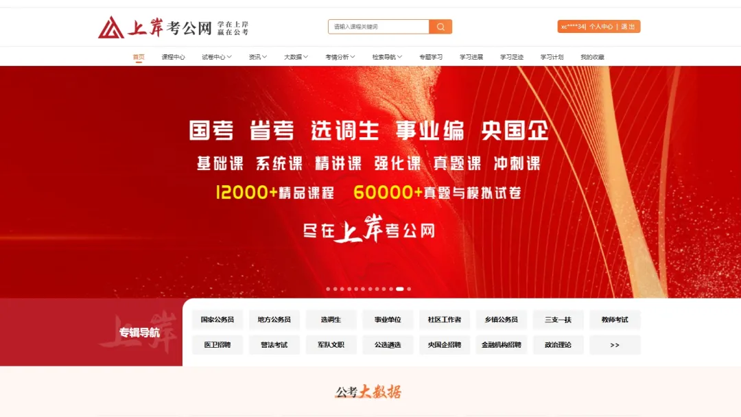 “上岸考公网”是专为同学们打造的,集一线名师视频课程、历年真题试卷、仿真模考试卷、个性化智能学习工具、大数据分析、可视化选岗于一体的公职类考试专业化学习平台。