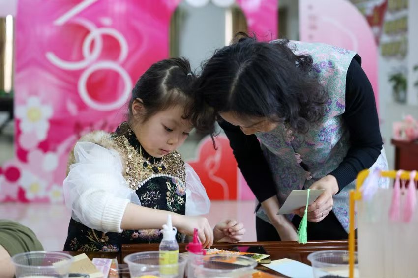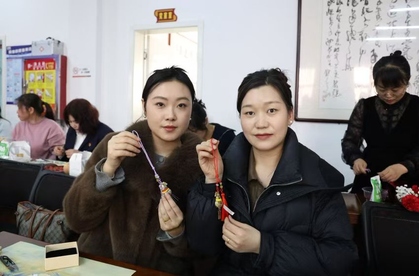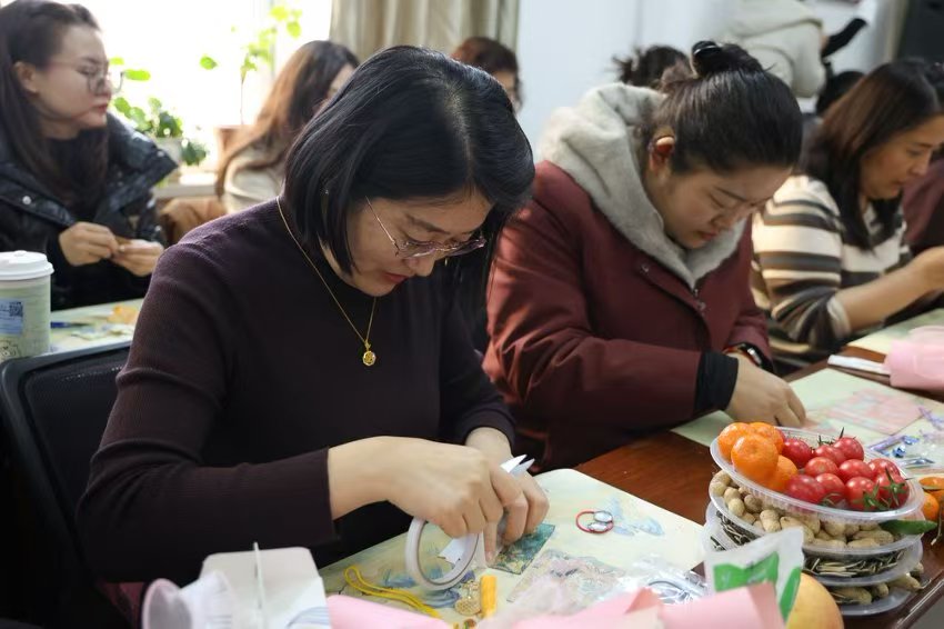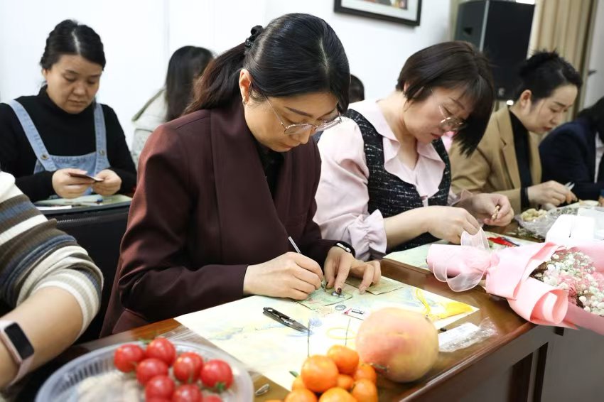 在“耕读芳华·巧手制签”手工制作沙龙环节,女教职工们在纳尔莎老师的指引下,亲手体验种子书签DIY和非遗宋锦吊坠制作。一颗颗种子被精心镶嵌进书签,寓意着阅读的希望在春日里生根发芽;一根根丝线在指尖穿梭,古老的宋锦技艺在巧手中焕发新生。大家专注创作、互相交流,在书香与手工的交融中放松心情、享受时光。“把春天夹进书里,把美好带回家。”参与活动的老师捧着自己制作的书签和吊坠,笑容温暖而满足。这份亲手创作的礼物,将陪伴她们走进今后的每一次阅读。
