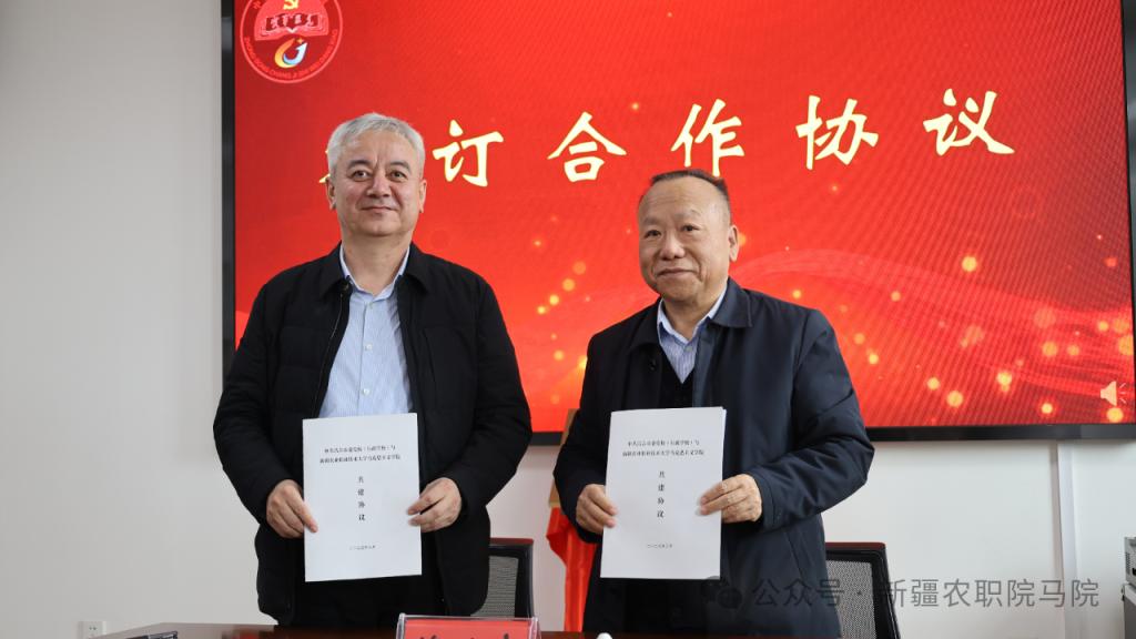 2025年3月3日,新疆农业职业技术大学马克思主义学院与中共昌吉市委党校(行政学校)正式签署共建协议,参与指导 “韩晓庭州名师工作室”。中共昌吉州委党校常务副校(院)长羊扬出席并致辞,新疆农业职业技术大学马克思主义学院党总支书记、院长、二级教授王学利代表学院和团队讲话,昌吉市政府党组成员、副市长司睿吉·克力木进行揭牌,并代表市委党校与我院签订共建协议。此次合作是新疆农业职业技术大学发挥高校资源优势、深化社会服务途径的新拓展,标志着校地协同育人和社会服务能力迈上新台阶。